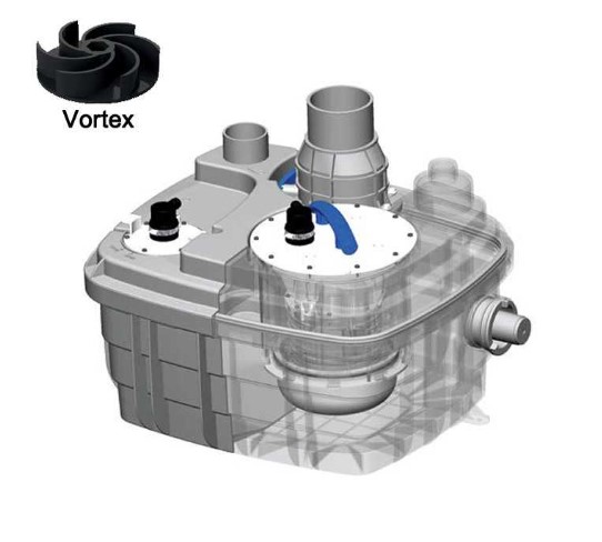 Sanicubic 2 VX — подъемная станция с двумя моторами и вихревыми насосами (vortex) для отвода сточных вод. Предназначена для коммерческого использования в тяжёлых условиях: рестораны, офисы, отели, прачечные и другие объекты с большим объёмом стоков. Сертифицирована по IP68, обеспечивает полную герметичность. Идеальна для напольной установки без котлована, с возможностью интеграции в систему управления зданием (BMS). Справляется с серыми стоками, включая жирные и агрессивные жидкости, с свободным проходом 50 мм.