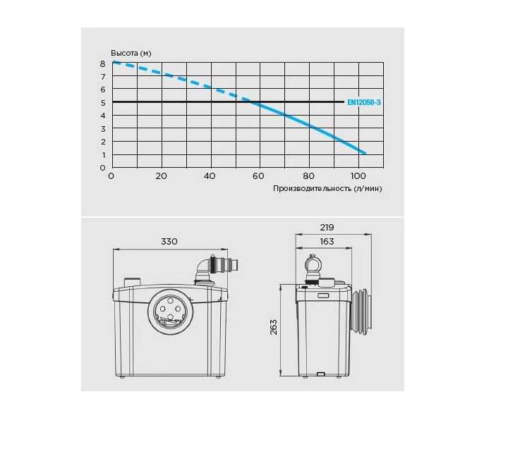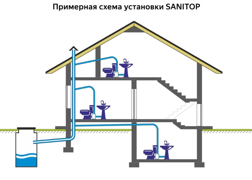 Канализационный насос-измельчитель SANITOP предназначен для сбора и отведения сточных вод, поступающих от унитаза и умывальника. Оборудование допускает установку ниже уровня основного сточного коллектора на глубину до 5 метров, при этом максимальная дальность транспортировки стоков по горизонтали составляет 100 метров. Допустимая температура перекачиваемых сточных вод не превышает +35 °С. Благодаря применению высококачественных материалов и продуманной конструктивной схеме насос отличается низким уровнем шума во время работы — он сопоставим с естественными звуками, характерными для туалетной комнаты. Питание устройства осуществляется от однофазной электрической сети напряжением 220–240 В с частотой 50 Гц.