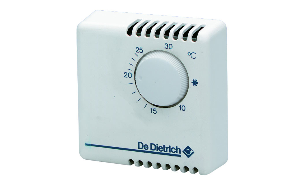 Непрограммируемый термостат De Dietrich AD 140 — это простое проводное устройство для поддержания комфортной температуры (6–30°C) в помещении путем управления горелкой котла. Подходит для широкого спектра котлов De Dietrich (MCR-P, DTGX, GT/U). Обеспечивает точное регулирование без необходимости программирования графиков.